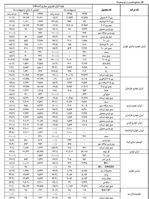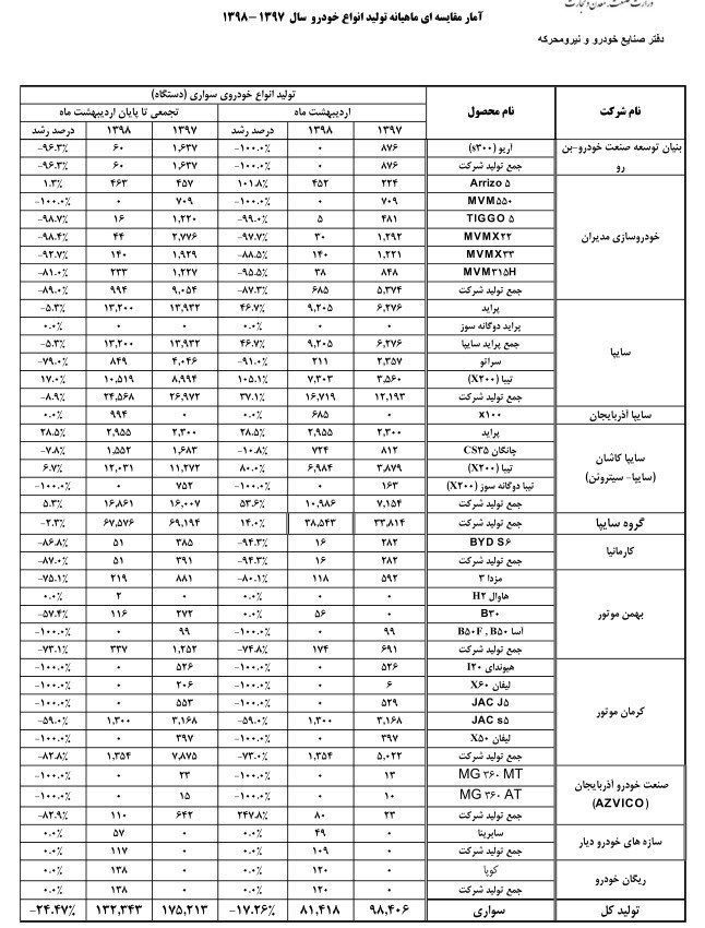 در این آمار تولید انواع خودرو در شرکت ایران‌خودرو در مقایسه با  اردیبشهت 97 کاهش54.0 درصدی و تولید سایپا کاهش 0.7 درصدی داشته است.