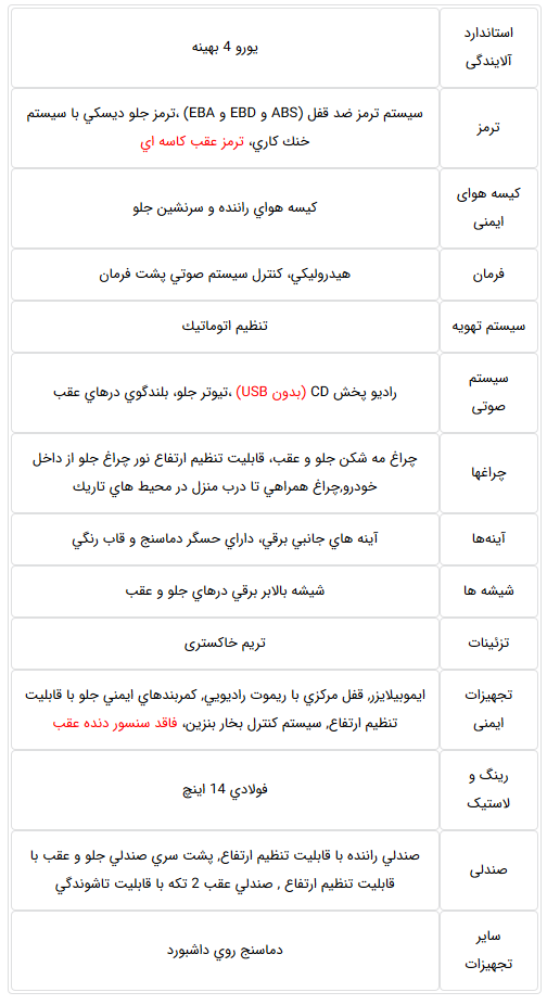 لیست کامل تجهیزات مدل های جدید پژو 206 صندوق دار کلاس 27434 و 27435: